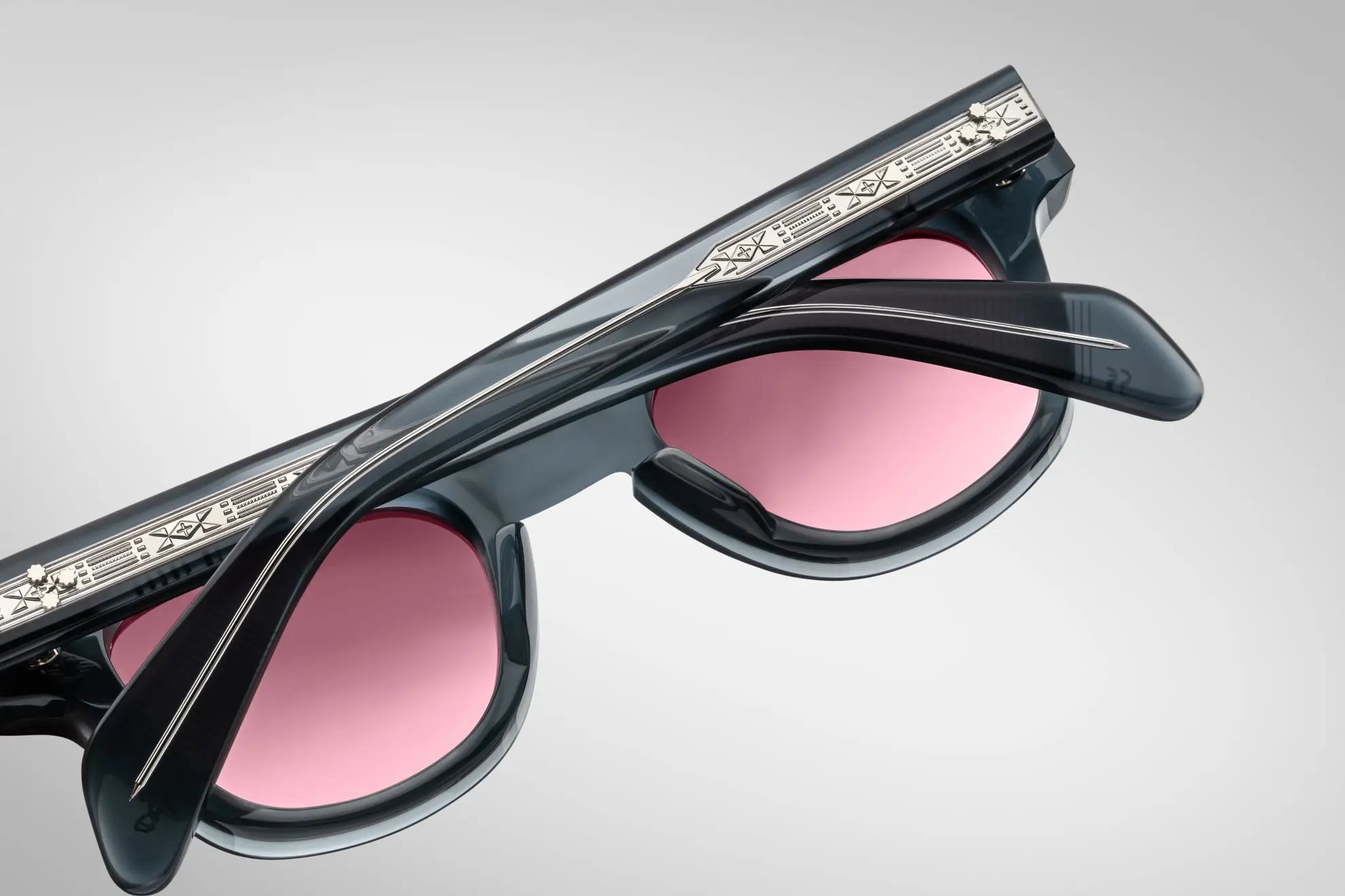 Grey 10mm Cured Cellulose Acetate Frame With Custom Double Laminated Acetate Temples Featuring Precious Metal Hardware And Heather Gradient CR39 6-Base Pink Lenses