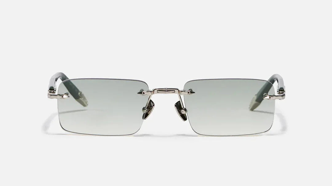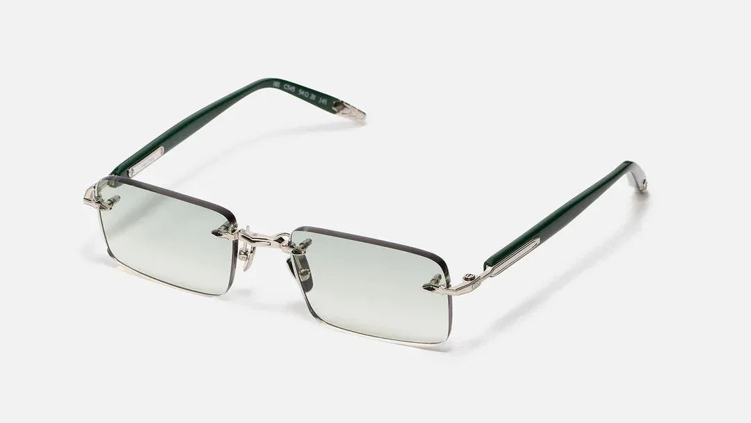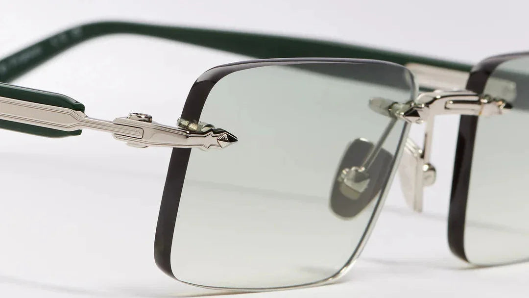 The temple structure transitions into a titanium-colored metal arm, adding a sleek contrast, and concludes with dark green acetate temple tips that ensure comfort, stability, and balanced weight distribution.
