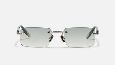 The design showcases a wide, grooved bridge with matching structured end pieces, creating a clean and architectural profile. Its internal metal corewire is crafted from stainless steel with a 3µ platinum plating, offering a cool-toned, highly refined finish.