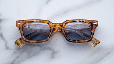 Havana 10mm Cured Cellulose Acetate Frame With Custom Double-Laminated Acetate Temples Featuring Precious Metal Hardware And Cerulean Blue Armorlite 4-Base Lenses
