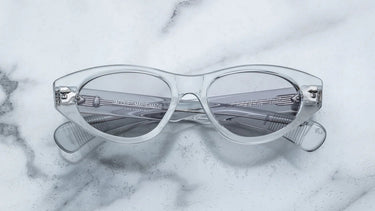Crystal 10mm Cured Cellulose Acetate Frame With Custom Double Laminated Acetate Temples Featuring Precious Metal Hardware And Grey Lenses
