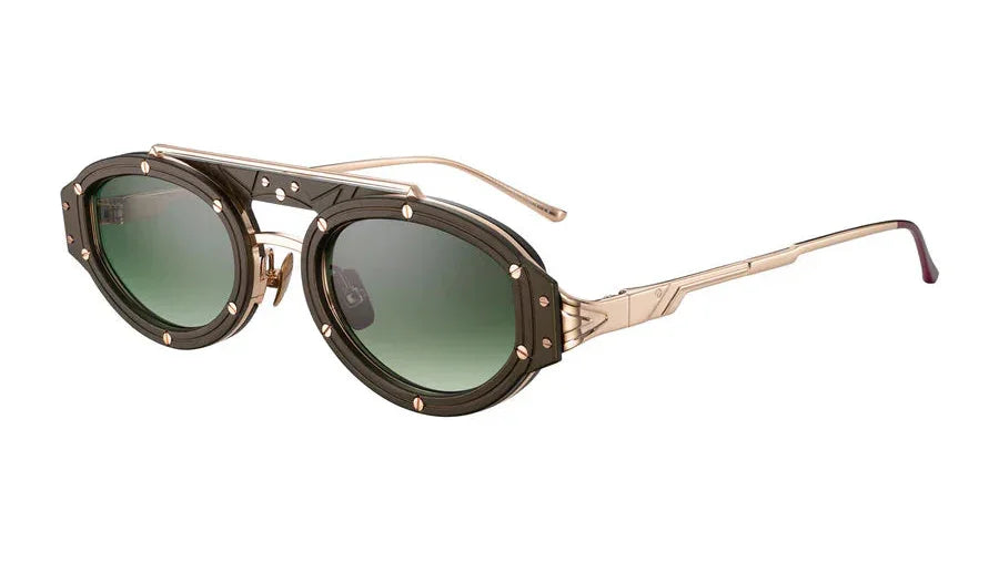 The rounded, panto-narrow silhouette is enhanced with green gradient lenses that deliver a calm, effortlessly sophisticated aesthetic. Polished stainless steel screws and Vysen’s signature red mark at the left temple elevate its luxurious appeal.