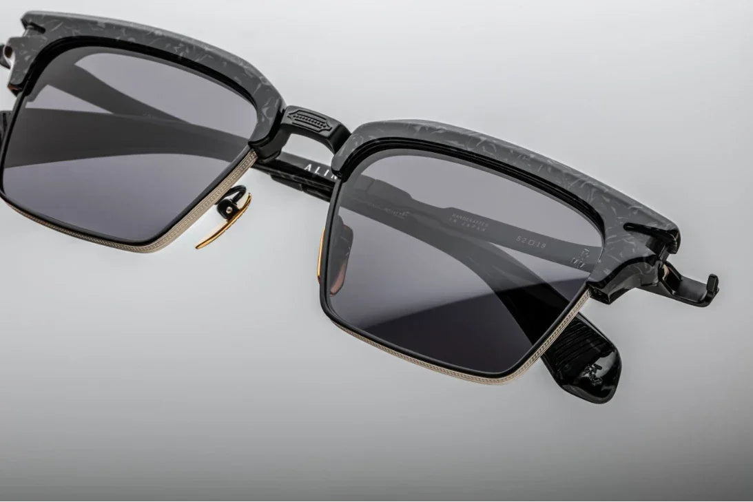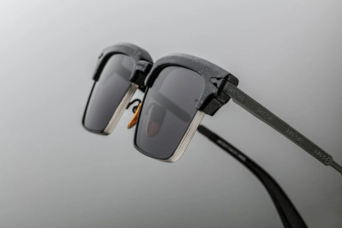 Handcrafted in Japan, the Alin Slate features a prominent acetate brow, square titanium lens rims, and finely engraved temples with a distinctive arrowhead motif — a hallmark of JMM’s celebrated craftsmanship. Produced in a limited edition, this sunglass evokes the confidence of an era defined by tailored elegance and modern ambition.