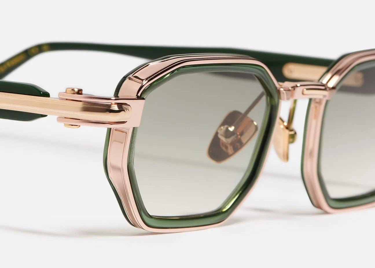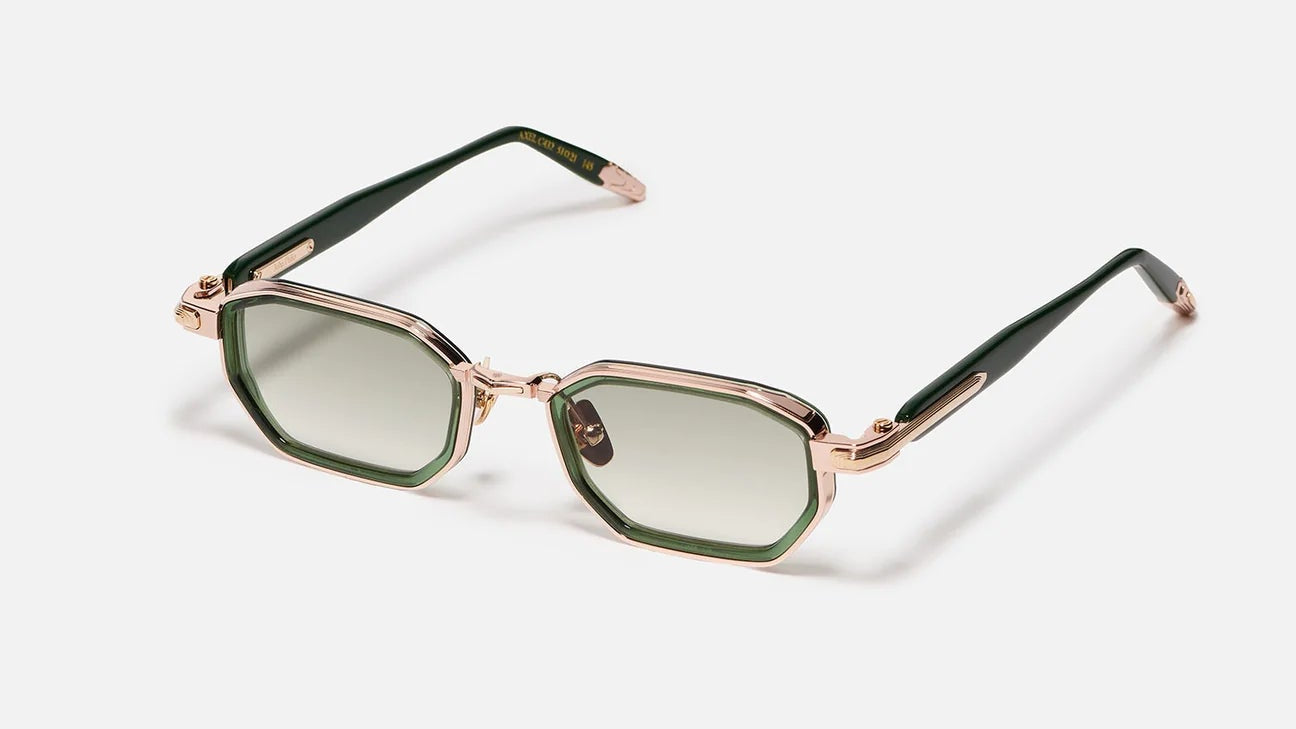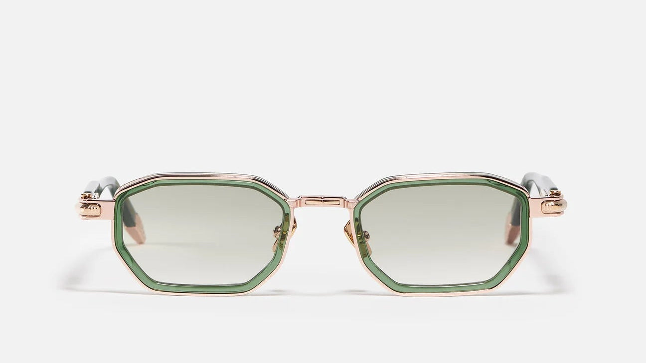Built around a rose-gold titanium corewire structure, the frame is enhanced with antique gold-plated decorative elements (5µ), complete with a jeweler’s hallmark engraved inside the temple. The rims and temple tips are crafted from dark green translucent acetate, adding depth and a distinctive visual identity.