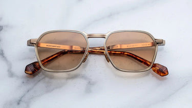Produced in a limited batch of 400 pieces, the Beckett Verona features a slender rectangular titanium silhouette with a medium fit, distinguished by meticulously ‘coined’ lens-rim edges and sculptural acetate accents. Inspired by the minimalist rigor associated with literary legend Samuel Beckett, this design evokes a world pared to its essentials - angular, articulate, and quietly unrelenting. The interplay of silver palladium eye rims with light gold fronts and 8mm clear beige acetate lens-rim inserts creates a refined tension between precision and warmth.