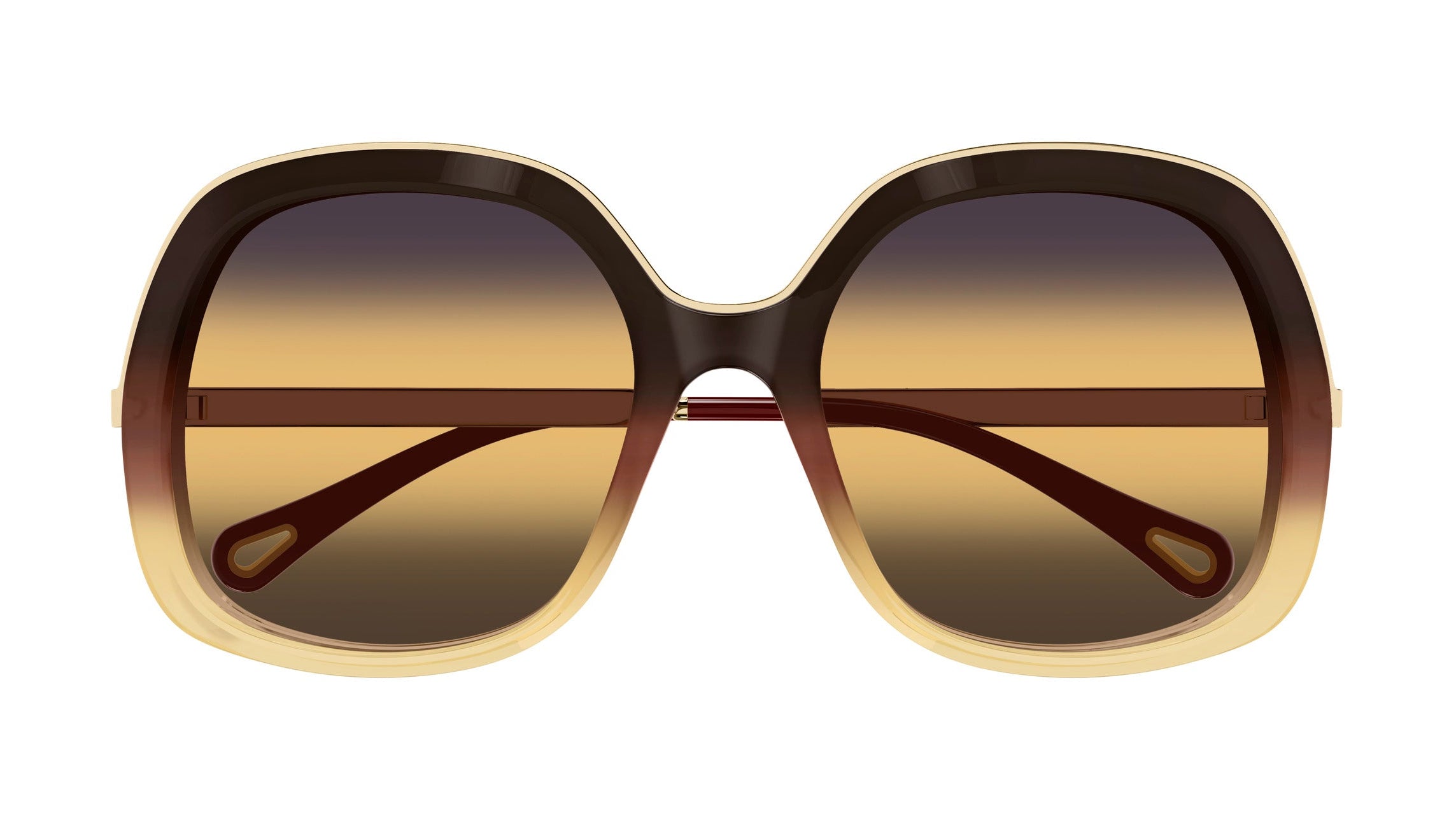 Colors: Warm brown acetate front, paired with polished gold metal temples and expressive yellow gradient lenses.