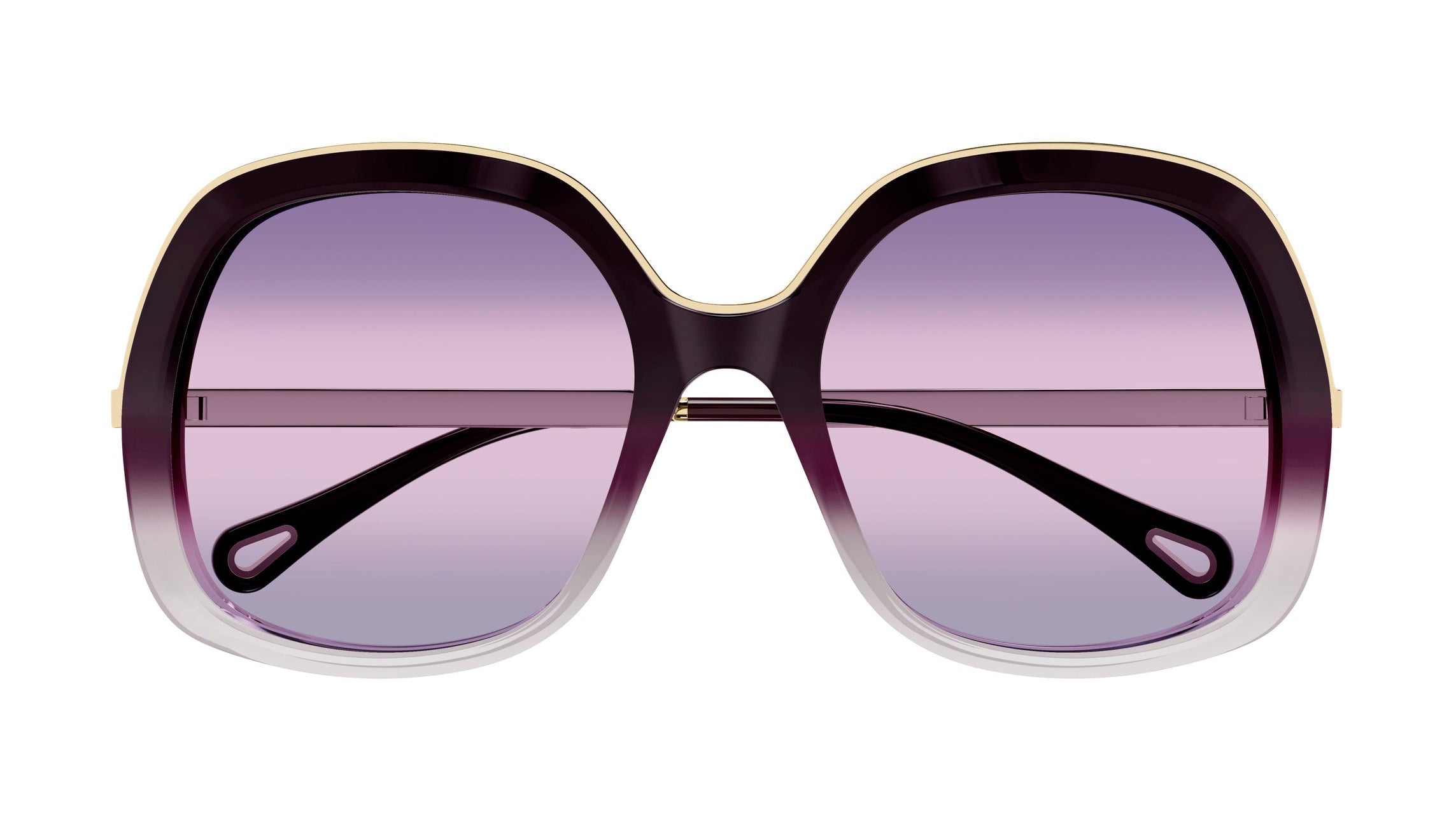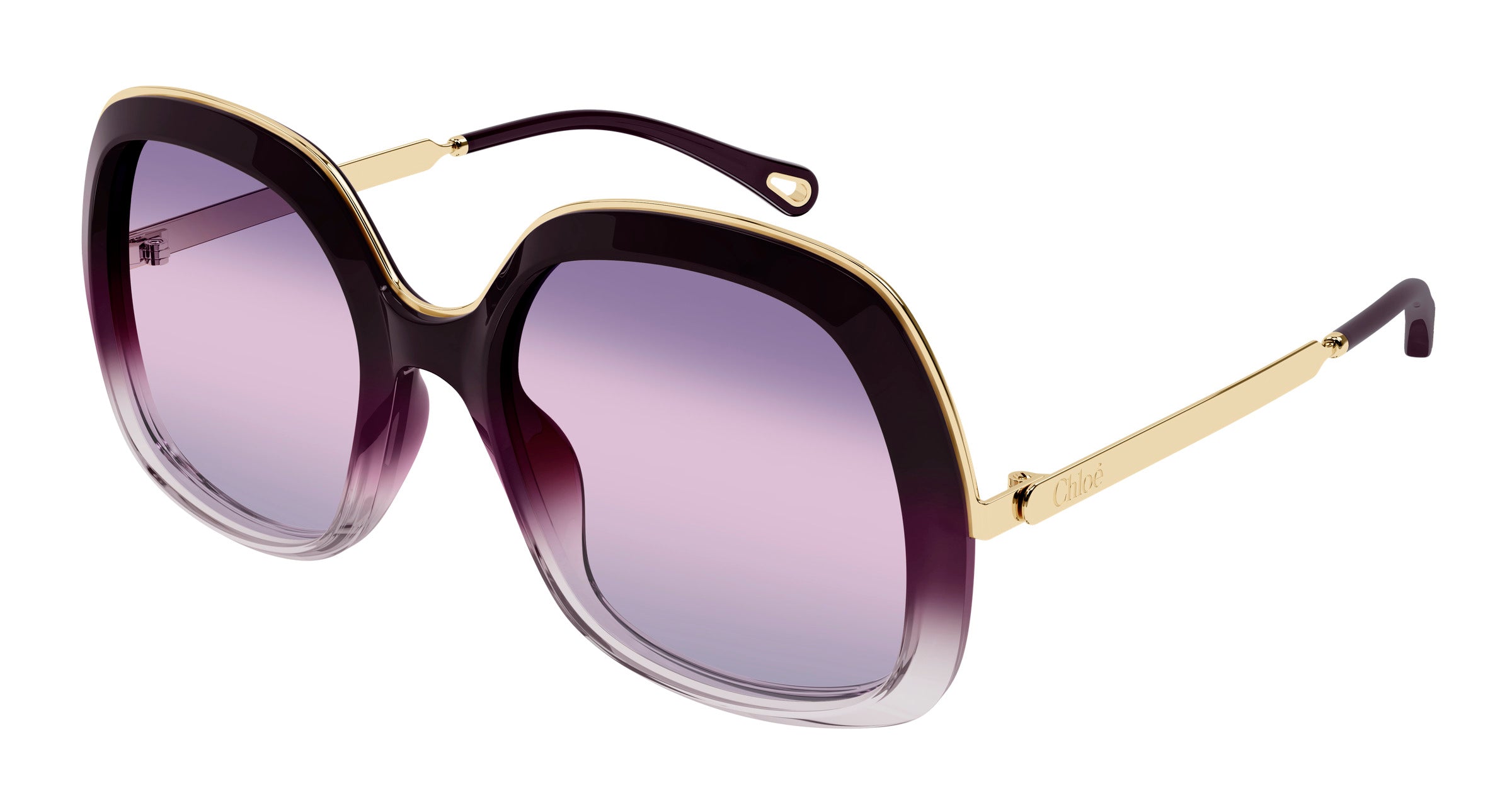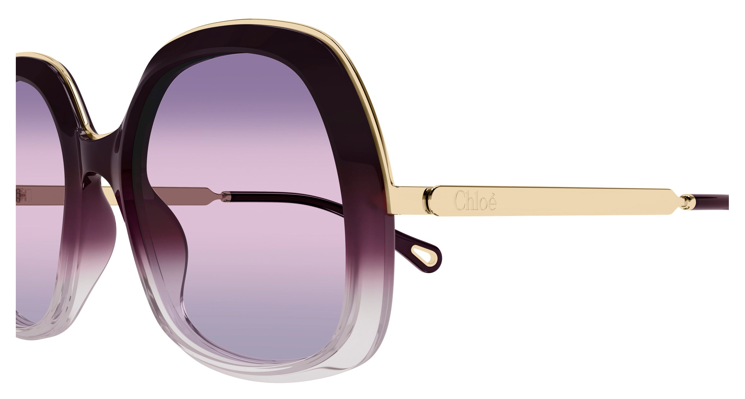 Colors: Deep burgundy acetate front, paired with gold metal temples and sophisticated violet gradient lenses.