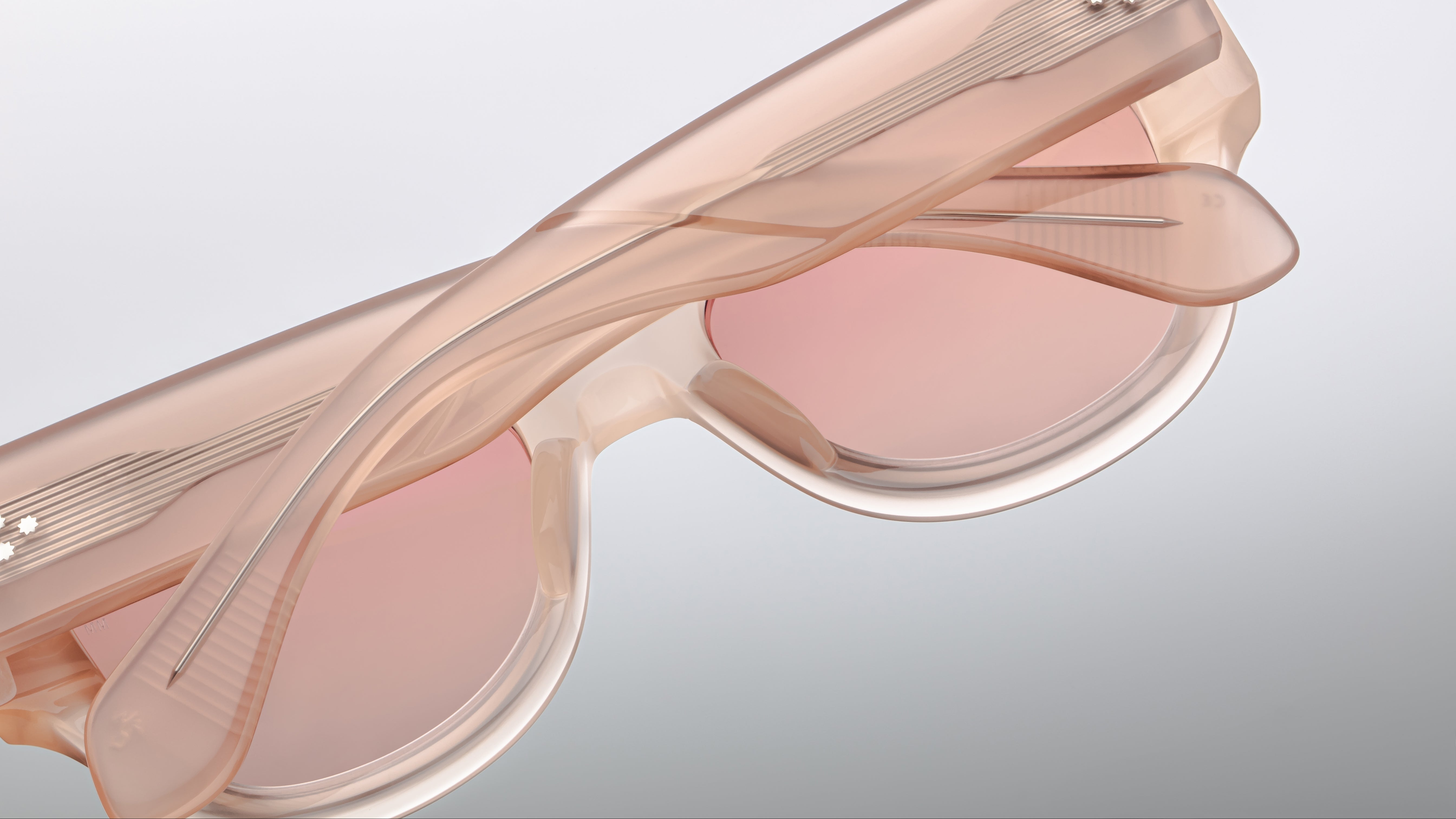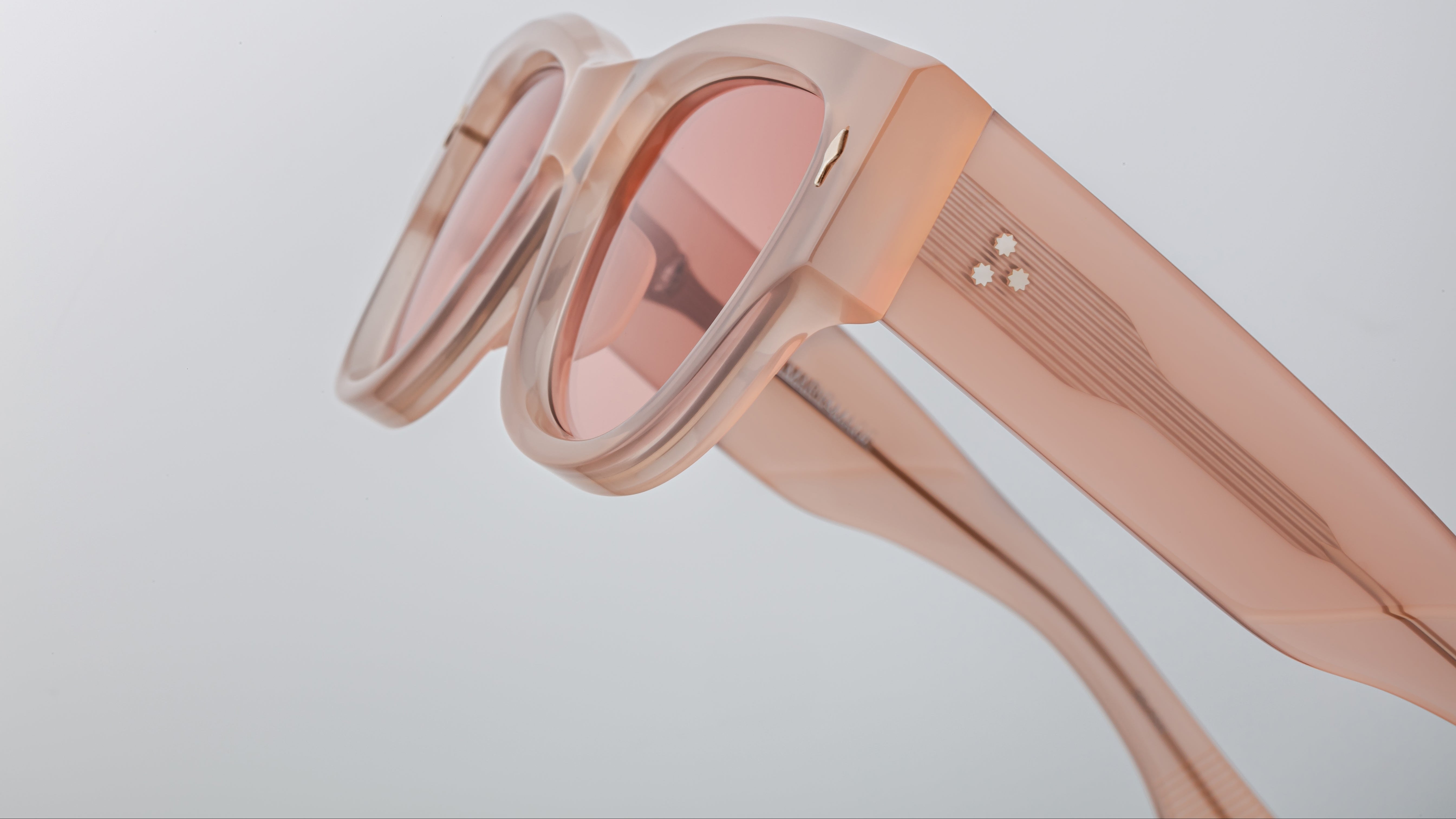 Handcrafted in Japan, the Chelsea Pink Quartz is defined by its soft Panto lens shape and oversized temples that envelop the form with graceful power. The design features new 7-barrel hinges for durability and ‘Cantilever’ wirecores with signature hairline engravings — reflecting JMM’s unwavering dedication to detail and proportion. The translucent pink quartz finish enhances the frame’s ethereal charm, offering a radiant play of light and color.