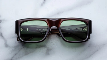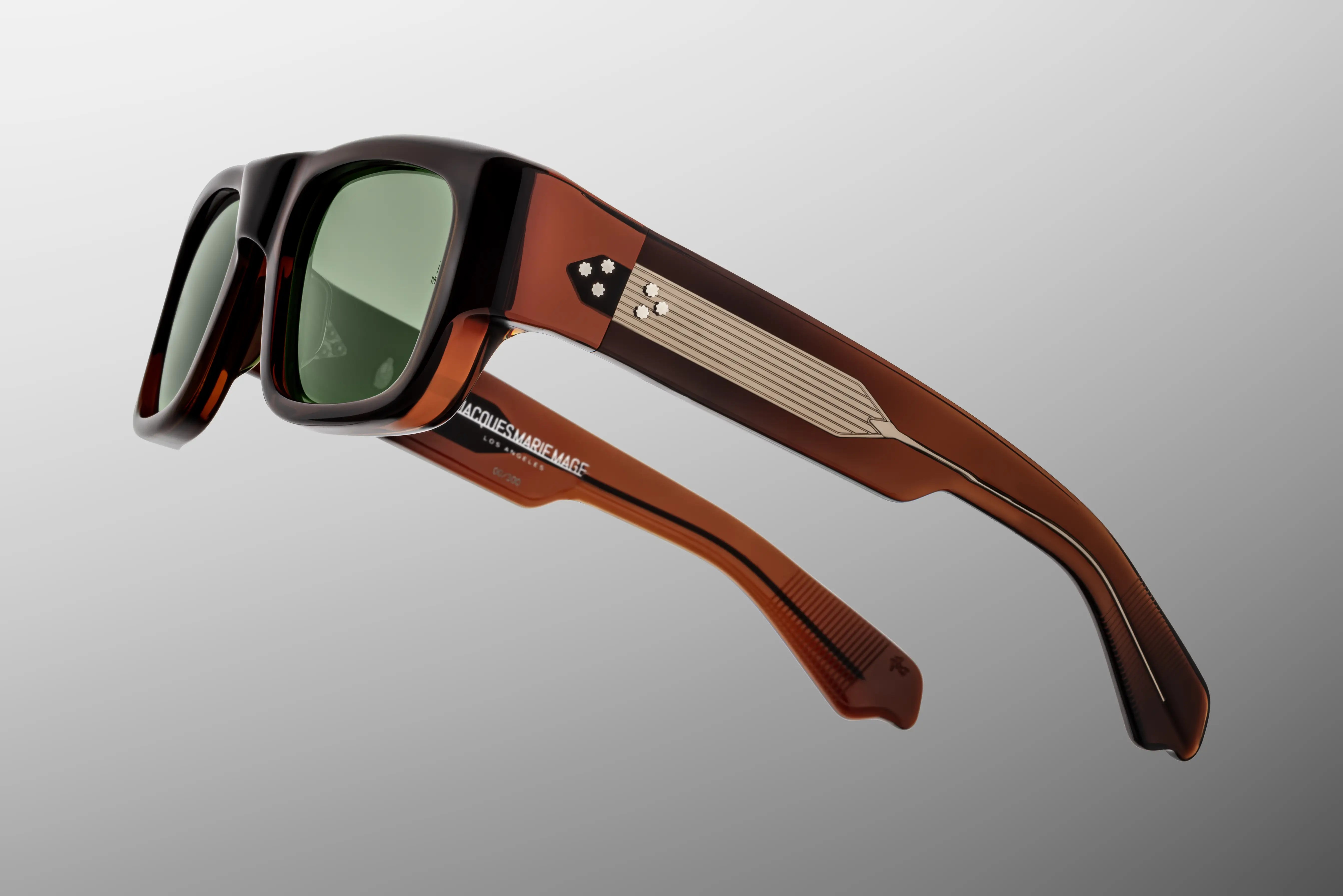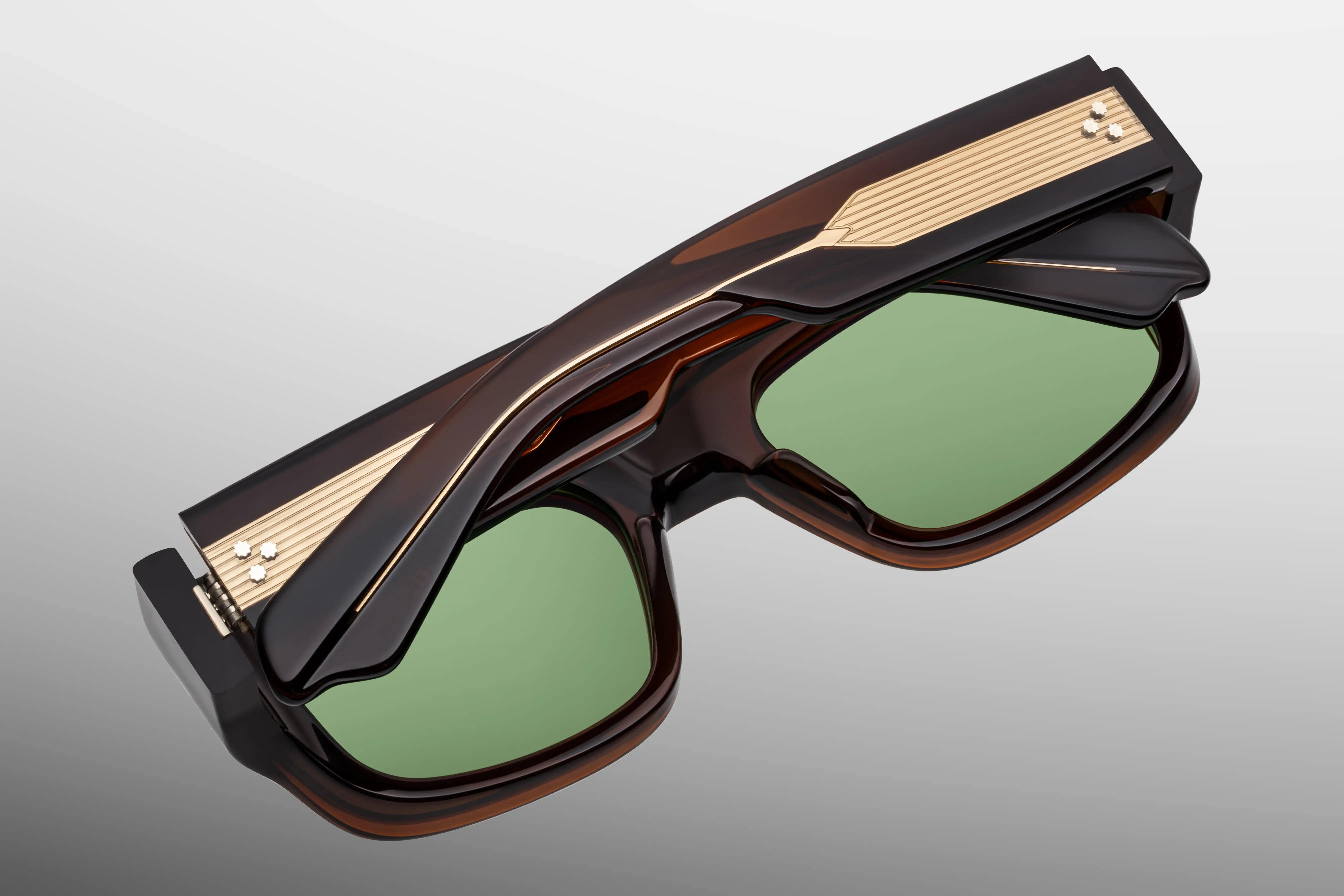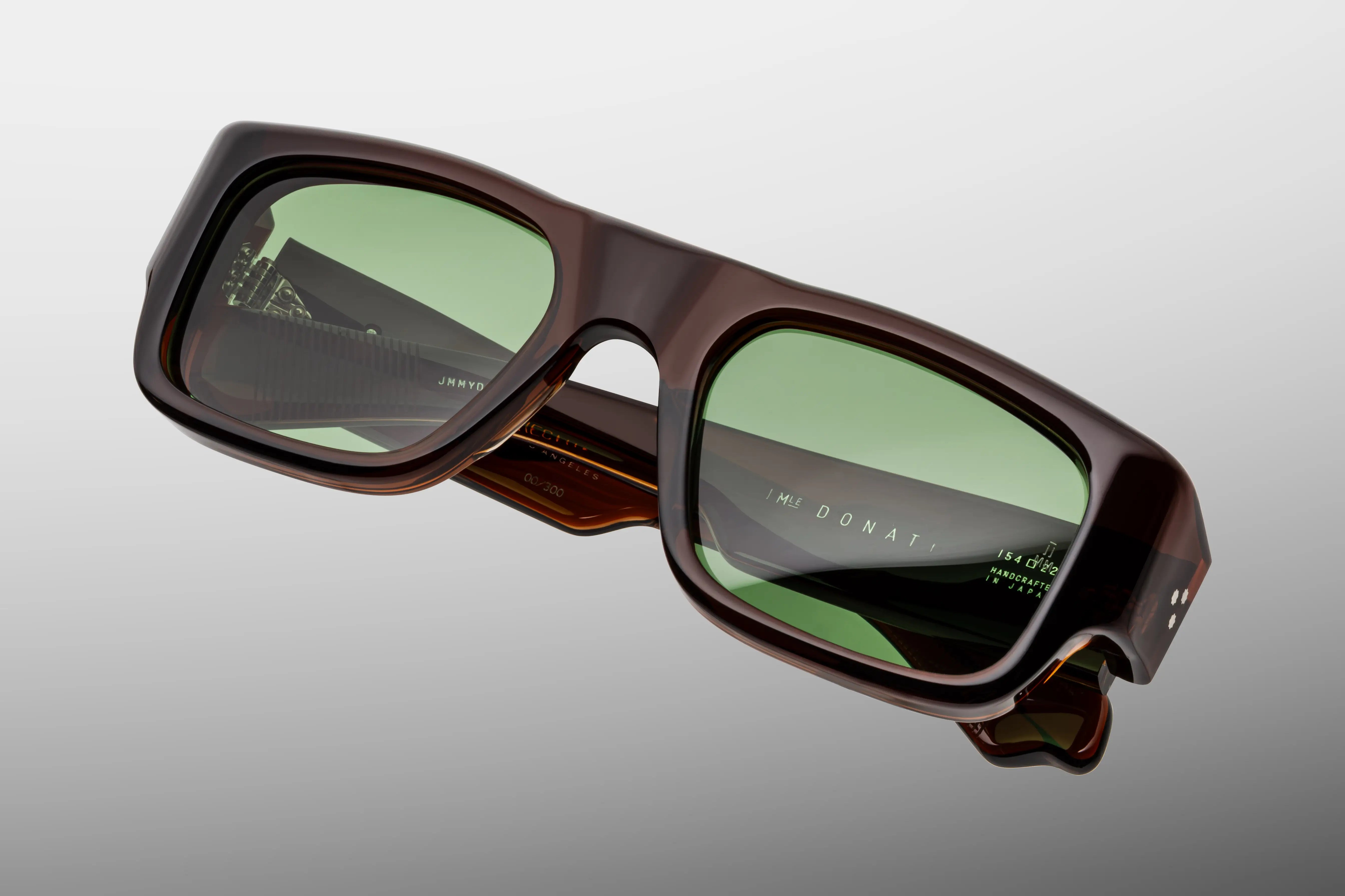 Designed as rectangular ’90s-inspired spectacles with a soft wraparound and balanced medium fit, the Donat Zoltar captures the confident spirit of ambitious French couturiers. Crafted from brown 10mm cured cellulose acetate with custom double-laminated acetate temples, the frame features precious metal hardware and expressive green lenses that enhance its tailored presence. Signature spur-shaped rivets, exposed silver-finished wirecores, and meticulously engineered hinge construction underscore JMM’s commitment to artistry and engineering excellence.