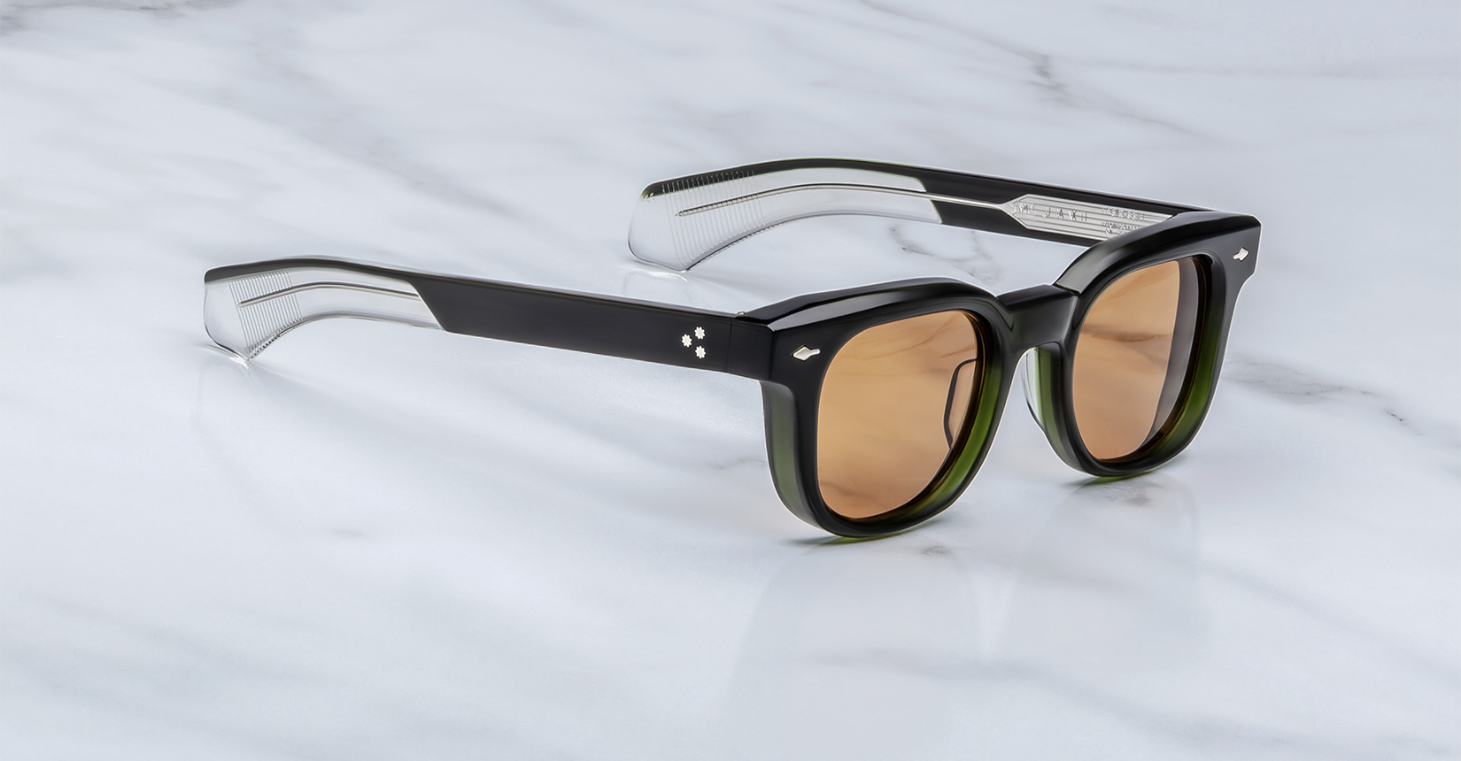The Jax 2 Borneo channels the spirit of Abstract Expressionism, inviting you to paint the canvas of your life with intention and individuality. Featuring a ’50s-inspired silhouette with a soft rectangular lens shape, the frame is sculpted from 10mm block-polished dark green cured cellulose acetate, delivering depth, richness, and architectural presence. Vivid orange Armorlite CR39 lenses create a striking chromatic contrast, while sterling silver detailing underscores its refined craftsmanship.