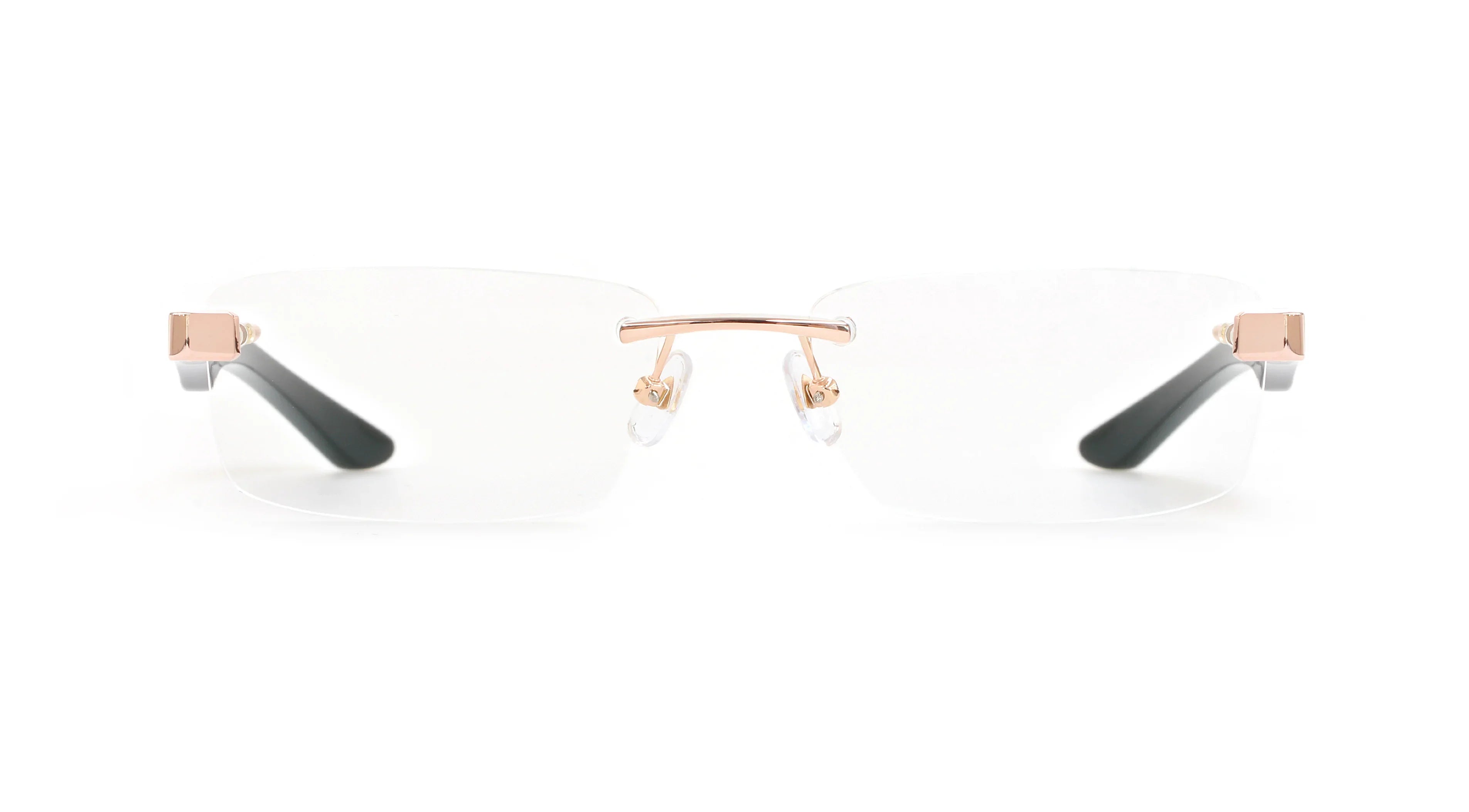 The clean, minimalistic lines of the rimless lenses are elevated by the natural beauty of horn, the warmth of fine wood, and the brilliance of rose gold plating. Lightweight yet durable, this frame embodies sophistication while ensuring lasting comfort.