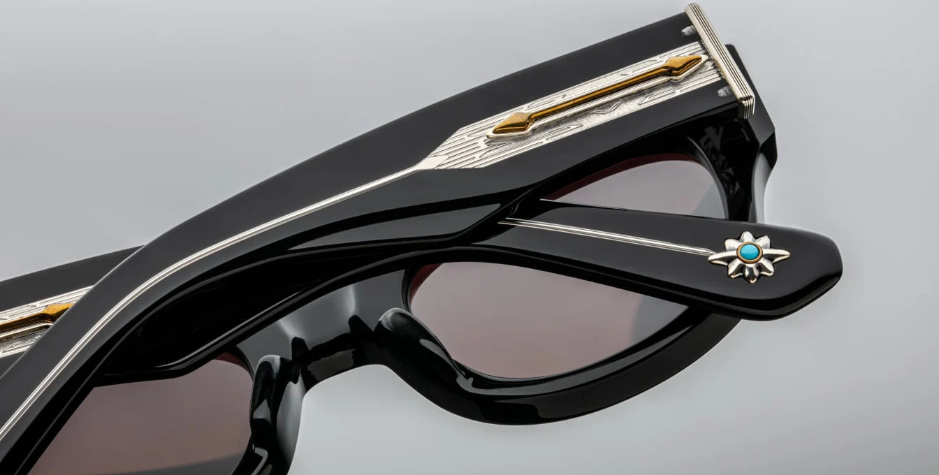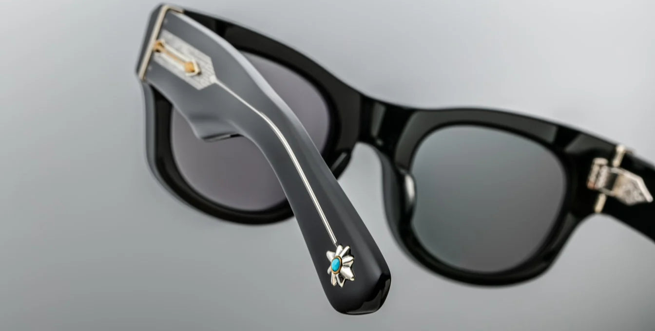 Handcrafted in Japan, the Truckee Noir showcases ornate double-arrowhead temple motifs and a beautifully detailed “blue flower” cameo with turquoise inlay at each temple tip—a hallmark of The Last Frontier Collection. With its fluid lines and sculptural details, this frame evokes the romance of open roads, rugged landscapes, and quiet determination beneath boundless skies.