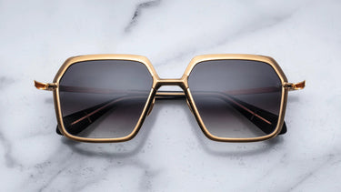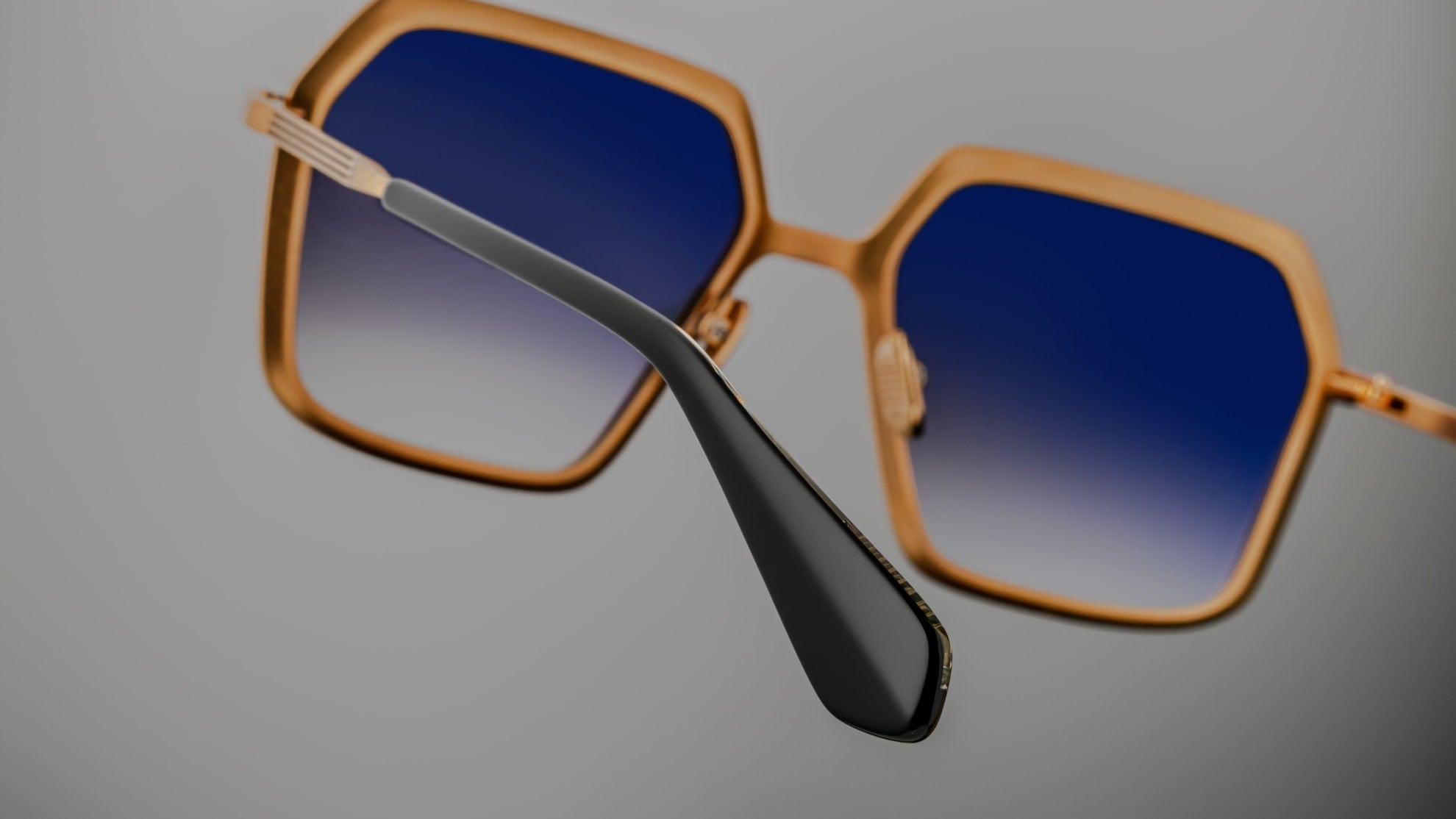 Featuring a hexagonal frame with a V-shaped profile, custom hidden hinges, and hairline epoxy detailing, the Ugo Gold showcases impeccable balance between bold form and minimalist luxury. Sculpted volumes and custom-cured acetate temple tips further elevate its distinctive look, ensuring comfort without compromise.