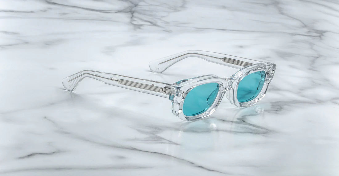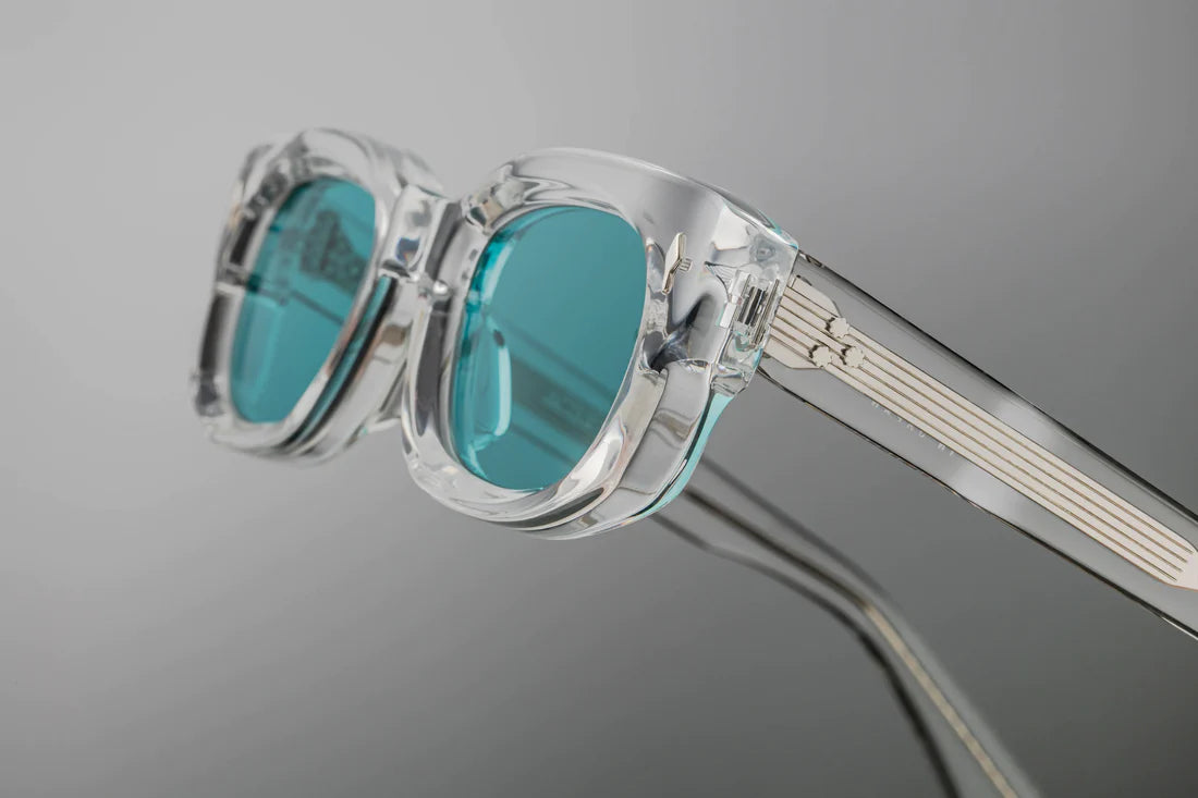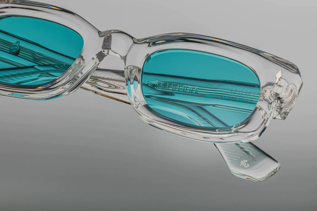 Produced in a limited edition of 200 pieces, the Whiskeyclone Clear features a medium-sized rectangular silhouette inspired by the 1990s, sculpted from 10mm clear cured cellulose acetate for striking transparency and architectural depth. Double-laminated acetate temples add structure and visual intrigue, while vivid cyan CR39 lenses introduce a modern chromatic edge. Designed with sterling silver hardware and exposed wirecore detailing, this frame balances nostalgia with refined craftsmanship.