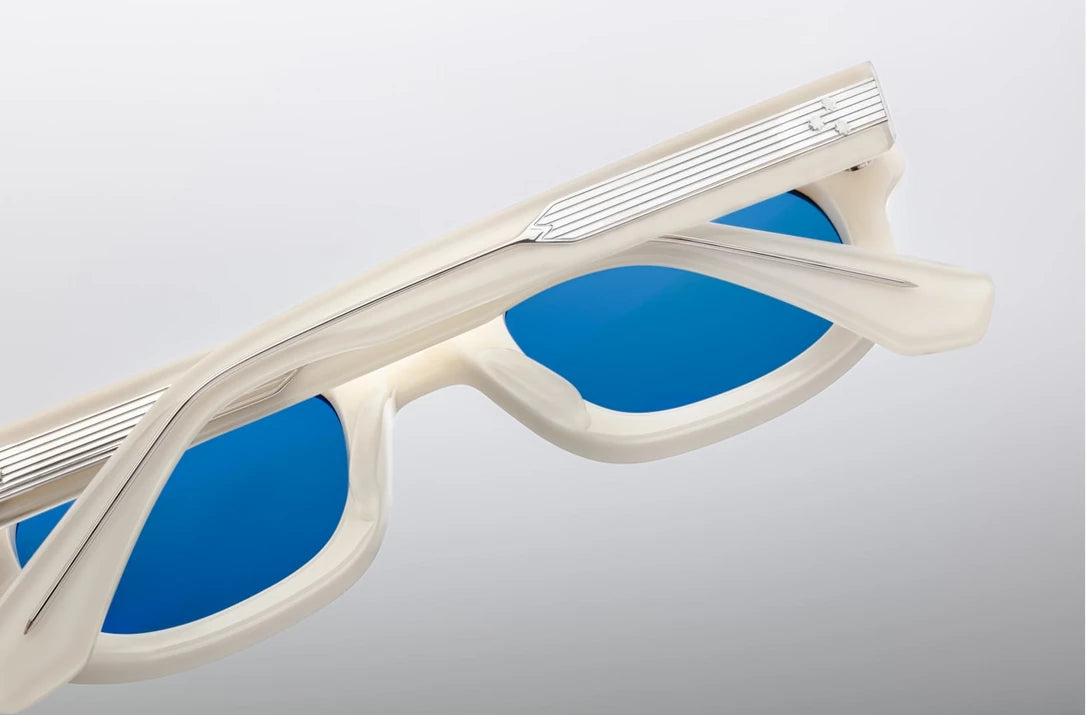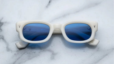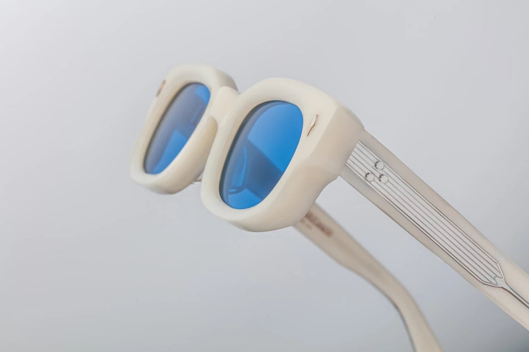 Produced in an ultra-limited batch of 150 pieces, the Whiskeyclone Mykonos features a medium-sized rectangular silhouette inspired by the 1990s, sculpted from striking white 10mm cured cellulose acetate. Custom triple-laminated acetate temples enhance depth and dimension, while vivid blue lenses introduce a bold visual counterpoint. Designed with precision-engineered silver hardware, this frame channels sartorial cynicism with a polished, contemporary edge.